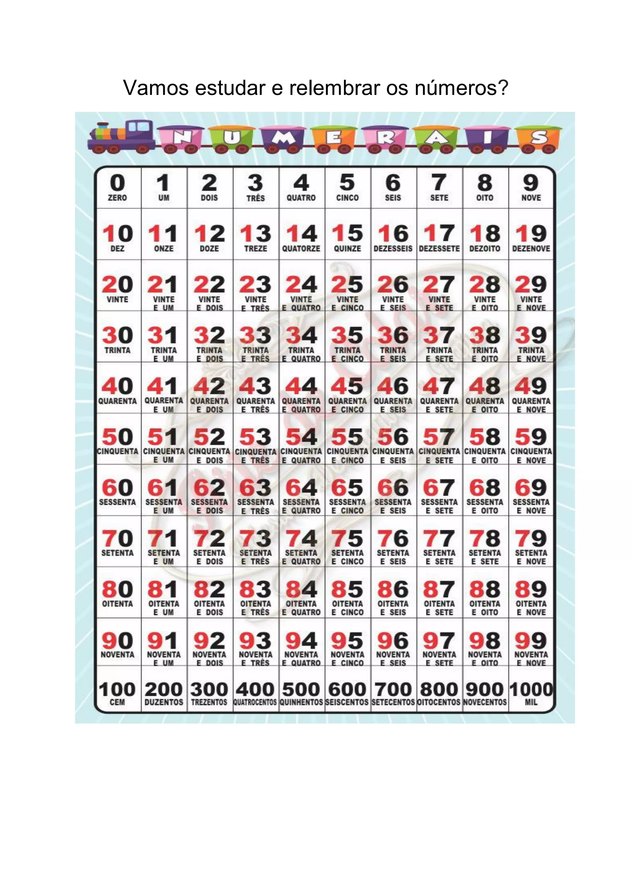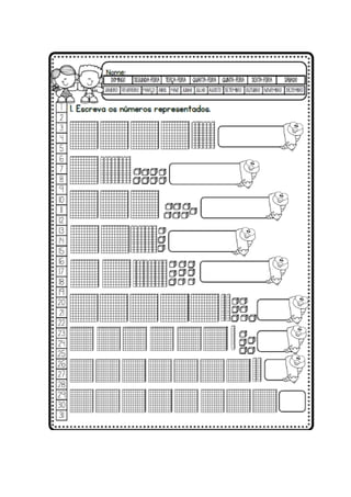 O documento revisa a representação de números e suas classificações como unidade, dezena e centena. Ele apresenta exemplos de números em forma escrita e numérica, além de um exercício de completar uma sequência numérica de 100 até 1.000, contando de 10 em 10. O foco principal é na compreensão da estrutura numérica e na prática de contar em intervalos específicos.