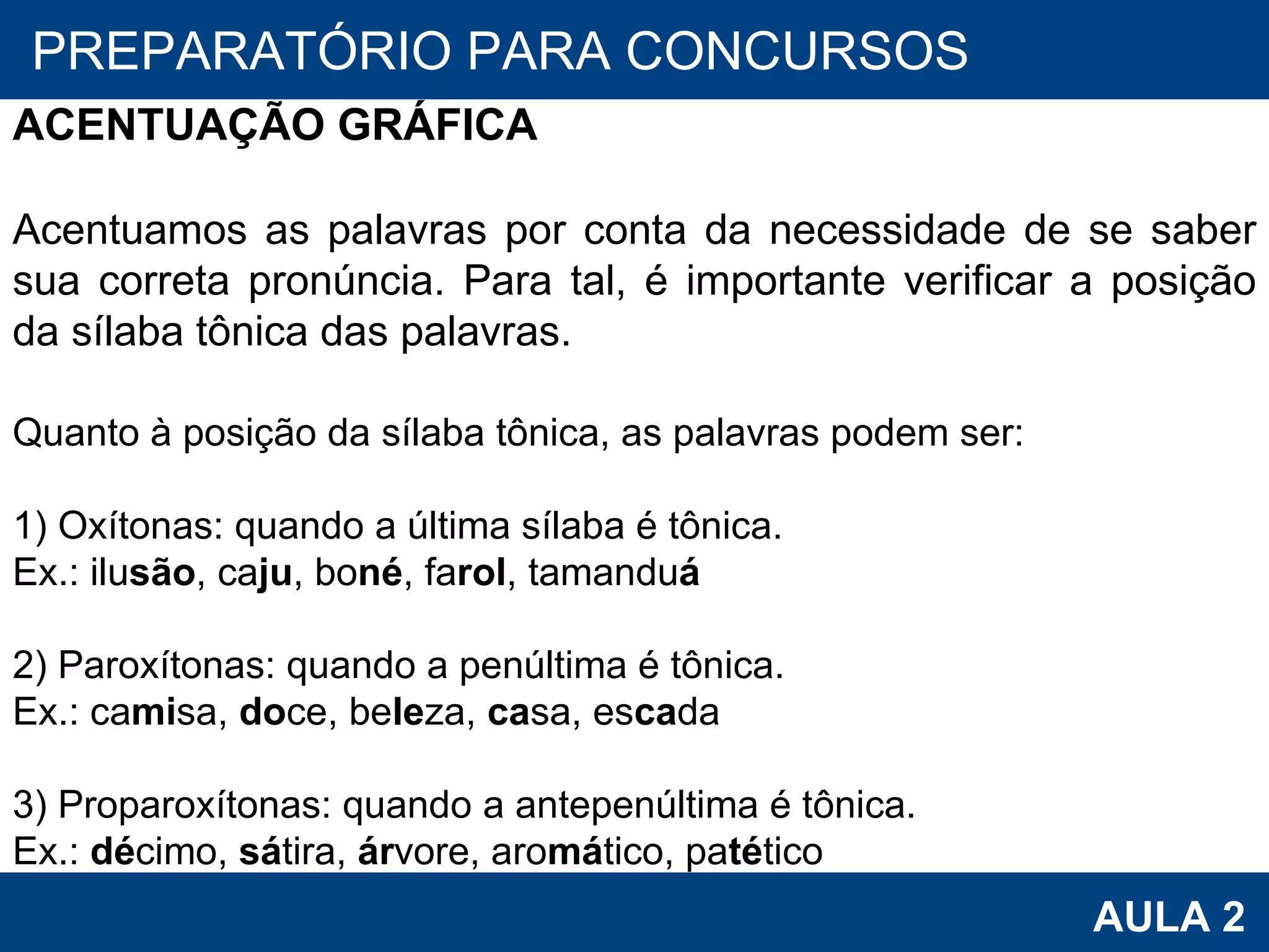 O documento discute regras de acentuação gráfica em português. Explica que a acentuação depende da posição da sílaba tônica e apresenta exemplos de palavras oxítonas, paroxítonas e proparoxítonas. Também lista regras gerais e casos especiais de acentuação e observações sobre ortografia e emprego de letras.