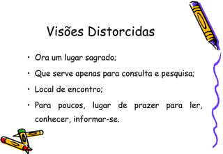 O documento discute o papel e objetivos da biblioteca escolar, incluindo incentivar o hábito da leitura nos alunos, apoiar o currículo escolar e promover o acesso a diversos materiais educativos. Também aborda projetos governamentais para fortalecer bibliotecas em escolas públicas e a importância de formação crítica e prazer na leitura.