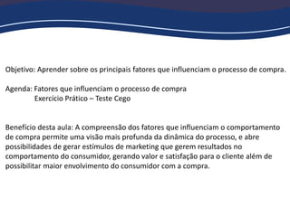 O documento discute os principais fatores que influenciam o comportamento do consumidor no processo de compra. Estes incluem fatores psicológicos como motivação, percepção e memória; fatores pessoais como idade, ocupação e personalidade; e fatores sócioculturais como grupos de referência, classe social e cultura. O documento fornece exemplos de como cada um desses fatores pode afetar as decisões e preferências de compra dos consumidores.