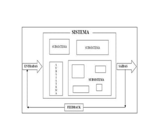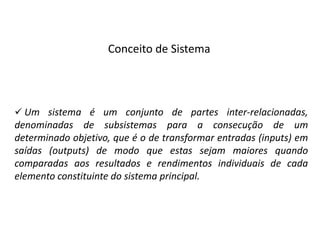 O documento discute conceitos básicos de sistemas, incluindo: (1) a definição de sistema como um conjunto de partes inter-relacionadas que transformam entradas em saídas; (2) as características dos sistemas como subsistemas e relações com sistemas maiores; (3) os tipos de sistemas fechados e abertos. Além disso, aborda modelos de organizações como sistemas abertos compostos de subsistemas interdependentes.