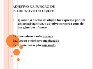 O documento discute regras de concordância de adjetivos em português. Apresenta casos em que o adjetivo concorda com o substantivo mais próximo no objeto, e outros em que concorda com o plural ou masculino plural dependendo do gênero dos substantivos. Também trata da variação ou não de certos adjetivos e advérbios.