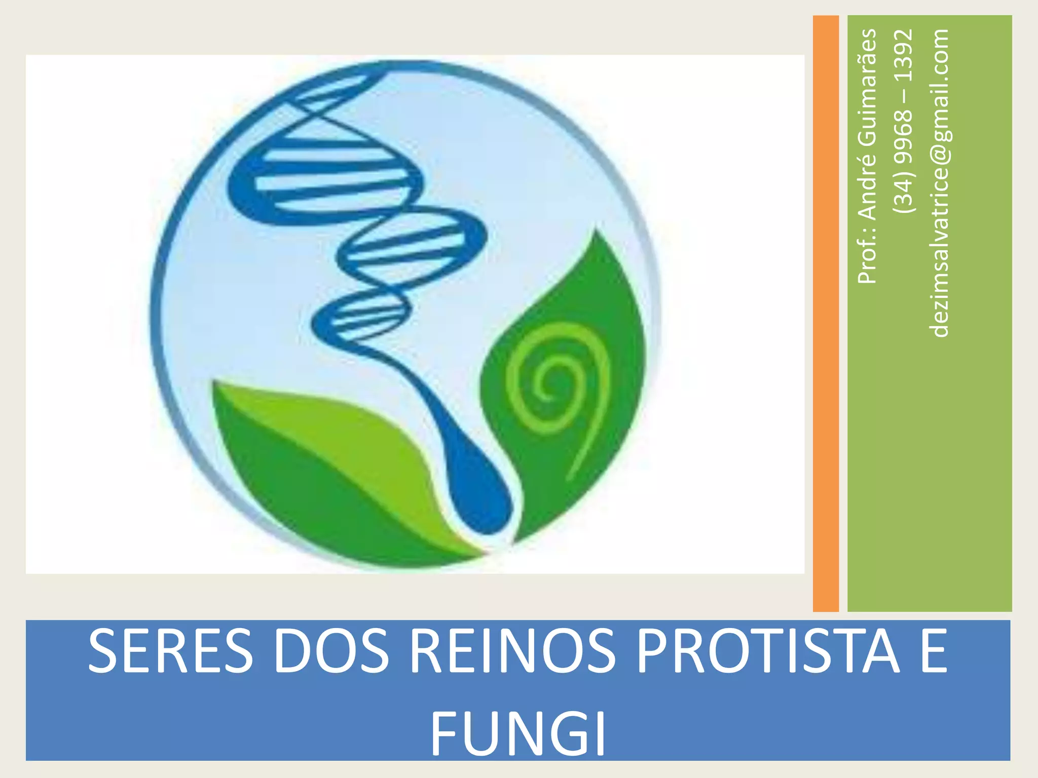 Este documento discute seres dos reinos Protista e Fungi. Ele fornece exemplos de protozoários como a ameba e algas como as vermelhas. Também discute fungos benéficos como aqueles formando micorrizas com raízes de plantas e fungos causadores de doenças.