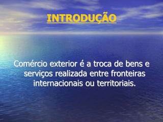 O documento discute os termos comerciais internacionais (Incoterms) que regulamentam a distribuição de responsabilidades em contratos de comércio exterior. Ele explica os quatro grupos de Incoterms de acordo com o local de entrega da mercadoria e fornece detalhes sobre termos específicos como EXW, FOB, CIF, DDP entre outros. Também define zonas primária e secundária em território aduaneiro.
