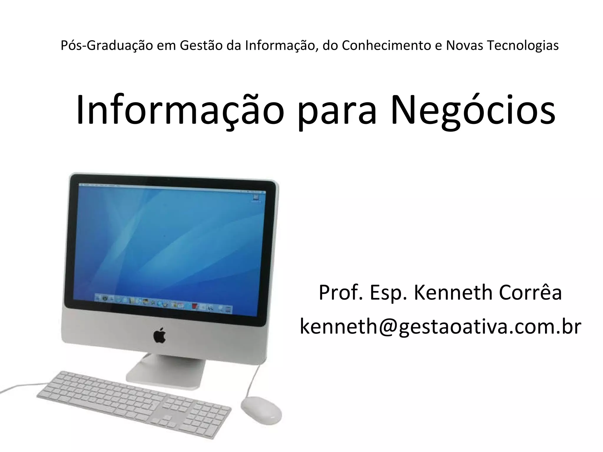 O documento aborda a pós-graduação em gestão da informação, destacando a importância do conhecimento nas organizações e sua aplicação para a inovação, redução de custos e diferenciação de produtos e serviços. Exemplos de práticas da empresa ABC Rações Animais são apresentados para ilustrar a gestão do conhecimento e a utilização de CRM. Além disso, são discutidos os tipos de conhecimento e a relevância do aprendizado contínuo na era da informação.