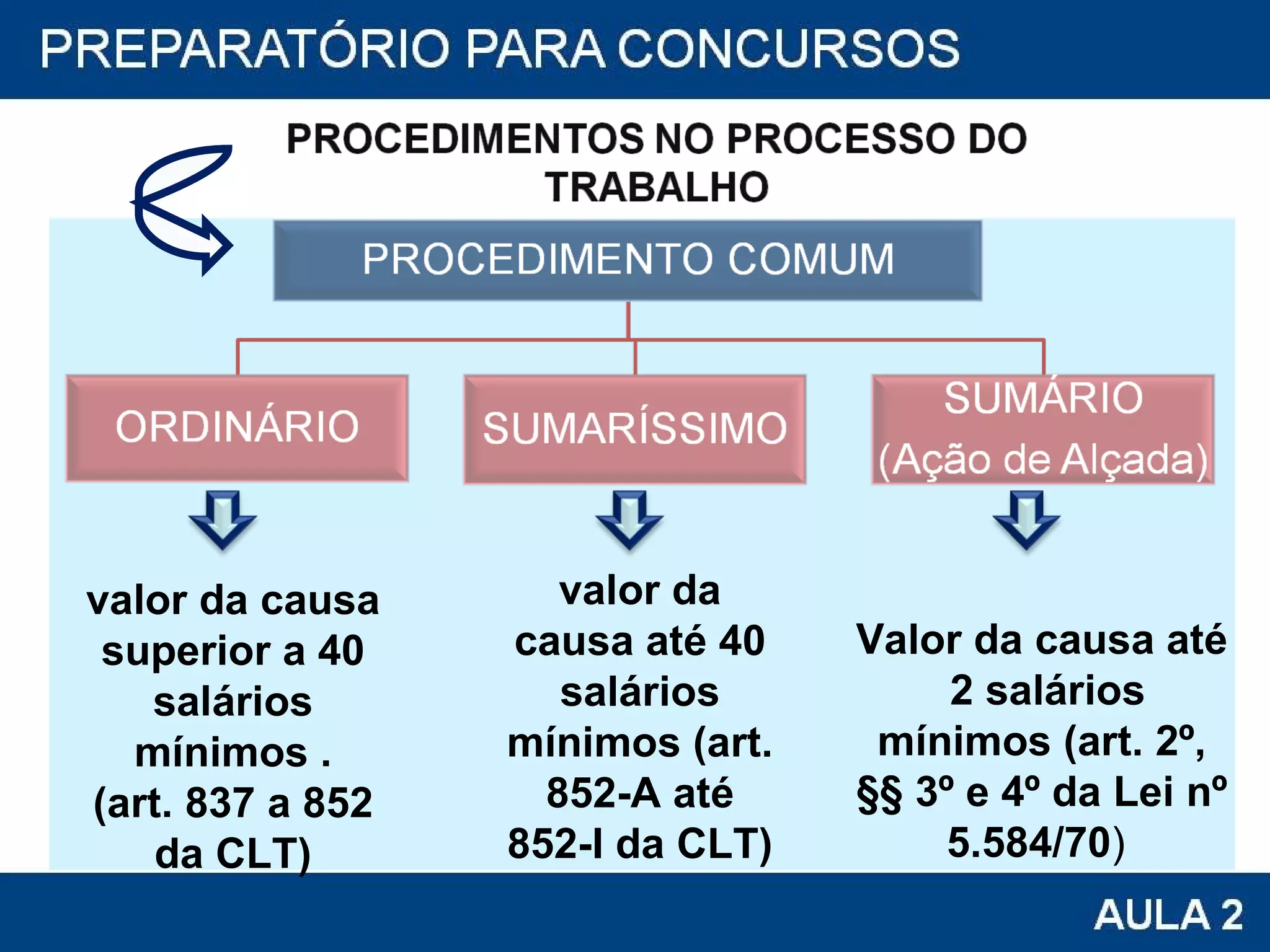O documento descreve os diferentes procedimentos trabalhistas no Brasil de acordo com o valor da causa. O procedimento sumário é para causas de até 2 salários mínimos, o sumaríssimo para causas de até 40 salários mínimos, e o ordinário para causas acima de 40 salários mínimos. Ele também detalha as etapas dos processos, como citação, audiência, instrução e recursos.