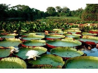 O documento descreve a evolução das plantas, desde as primeiras algas na água há 500 milhões de anos até as angiospermas modernas. Detalha a classificação dos vegetais em algas, briófitas, pteridófitas, gimnospermas e angiospermas, e como cada grupo conquistou novos ambientes e características ao longo do tempo.