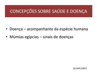 O documento descreve a evolução histórica das concepções sobre saúde e doença desde as sociedades antigas até os dias atuais, passando por visões mágico-religiosas, hipocráticas, renascentistas, bacteriológicas e determinação social. A concepção atual enfatiza múltiplos fatores e a promoção da saúde como direito humano.