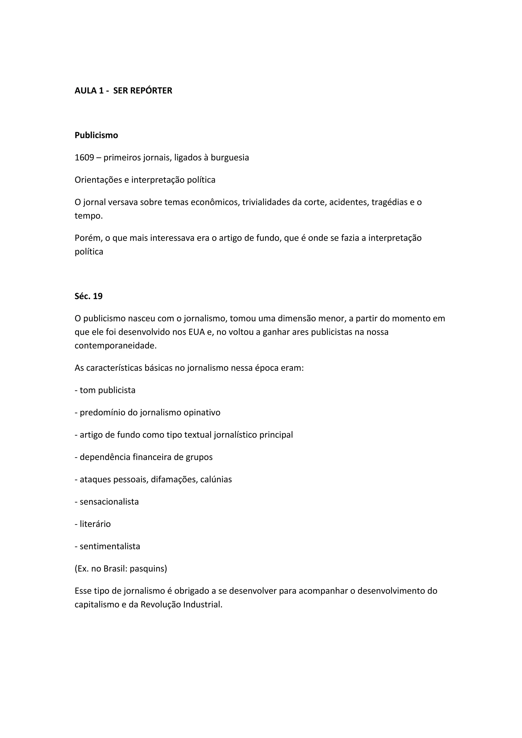 O documento descreve a evolução da profissão de repórter ao longo dos séculos 19 e 20, desde os primeiros jornais no século 17 focados em interpretação política até o desenvolvimento do jornalismo como uma técnica no século 19-20 com a introdução de novas abordagens como a busca por notícias exclusivas e divisão do trabalho.