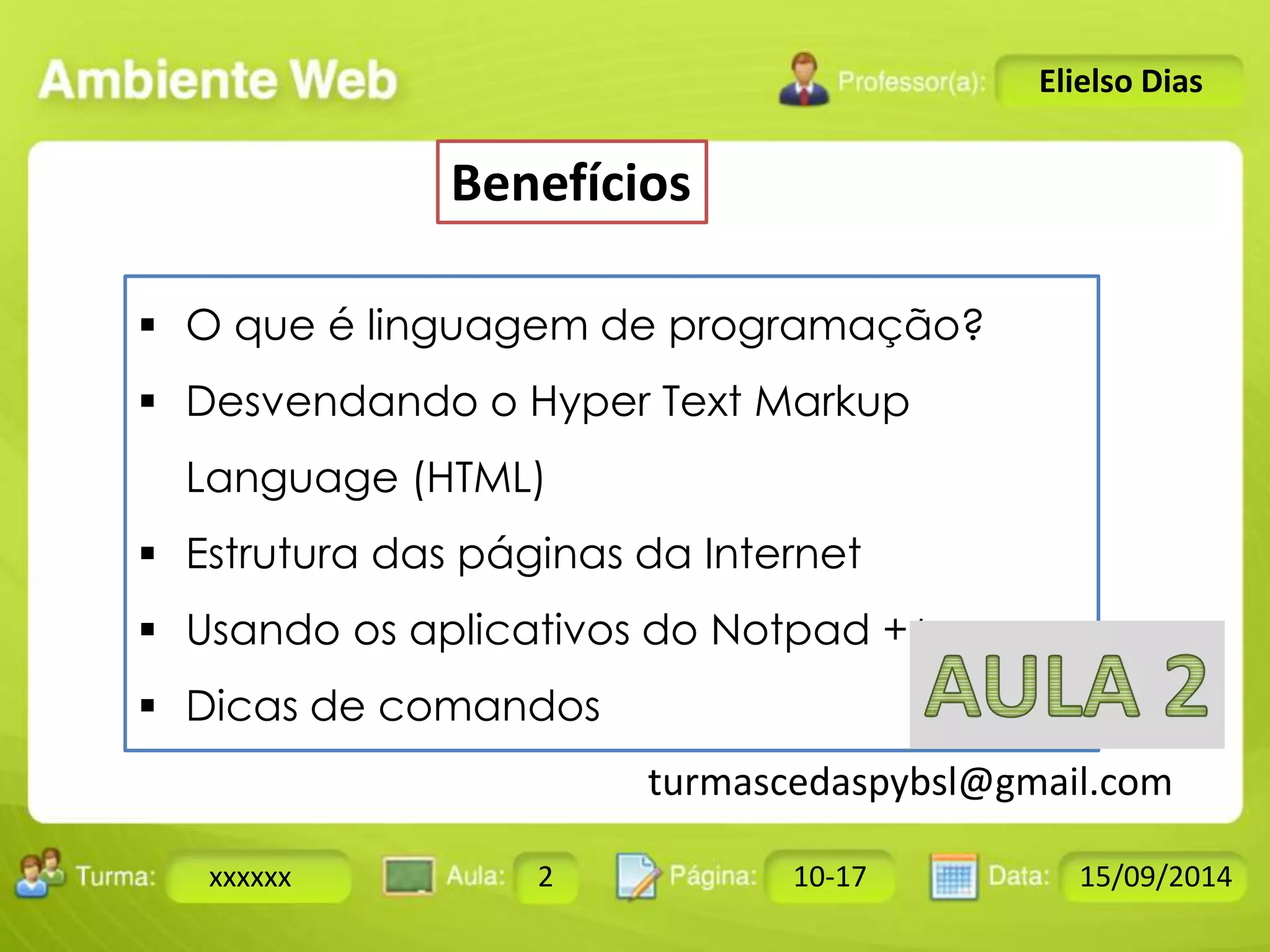 O documento discute a linguagem HTML: (1) HTML é usada para criar páginas da web e todos os documentos na internet são escritos nela, (2) a estrutura lógica de HTML usa tags para formatar o conteúdo, (3) o documento fornece exemplos de como usar diferentes tags HTML.