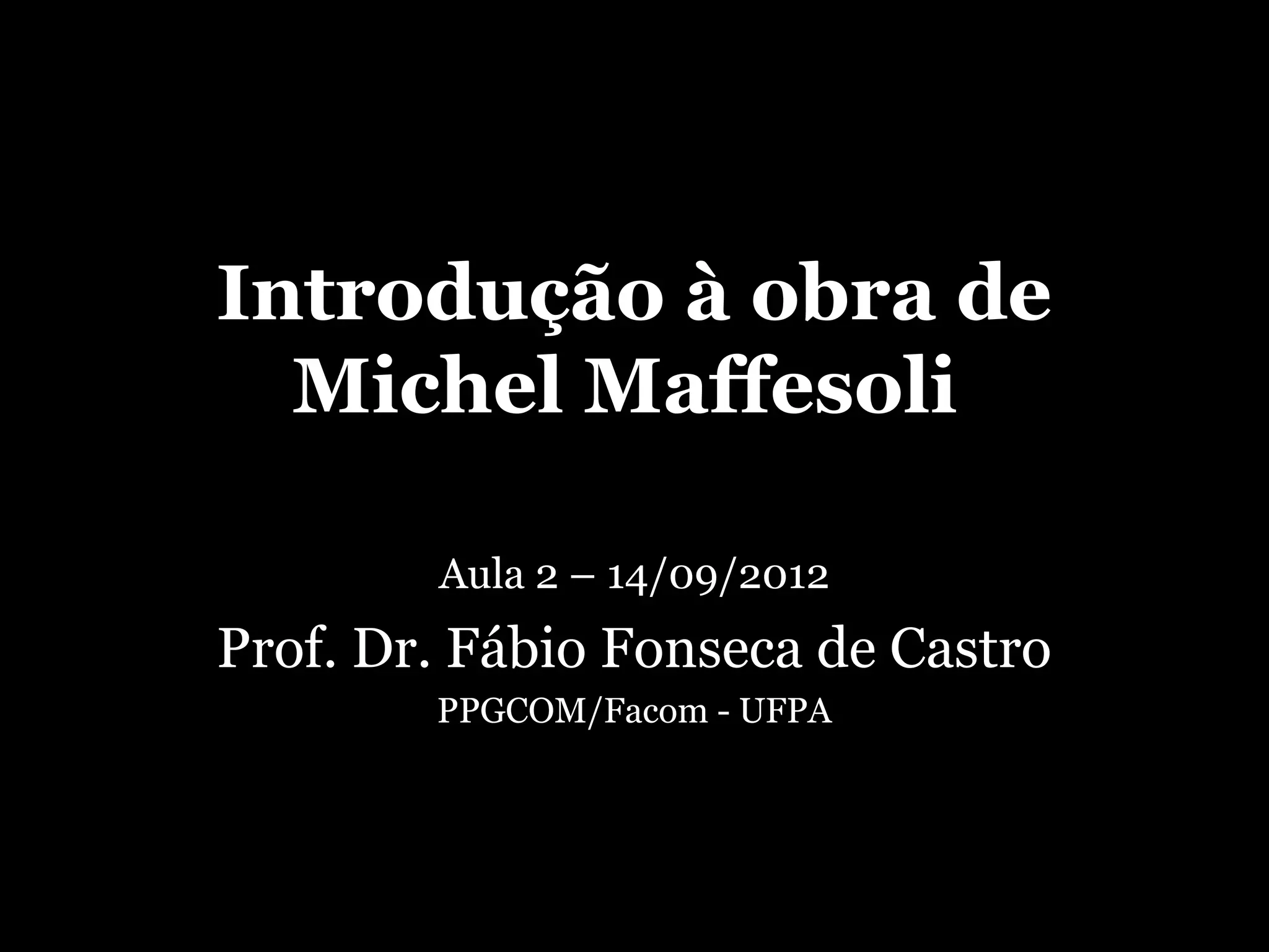 O documento discute as ideias do sociólogo Michel Maffesoli sobre a pós-modernidade. A pós-modernidade se caracteriza por (1) acumulação e aglomeração do passado ao invés de esquecê-lo, (2) crítica ao universalismo racional e ao humanismo progressista, e (3) ênfase na identificação tribal em vez do indivíduo.