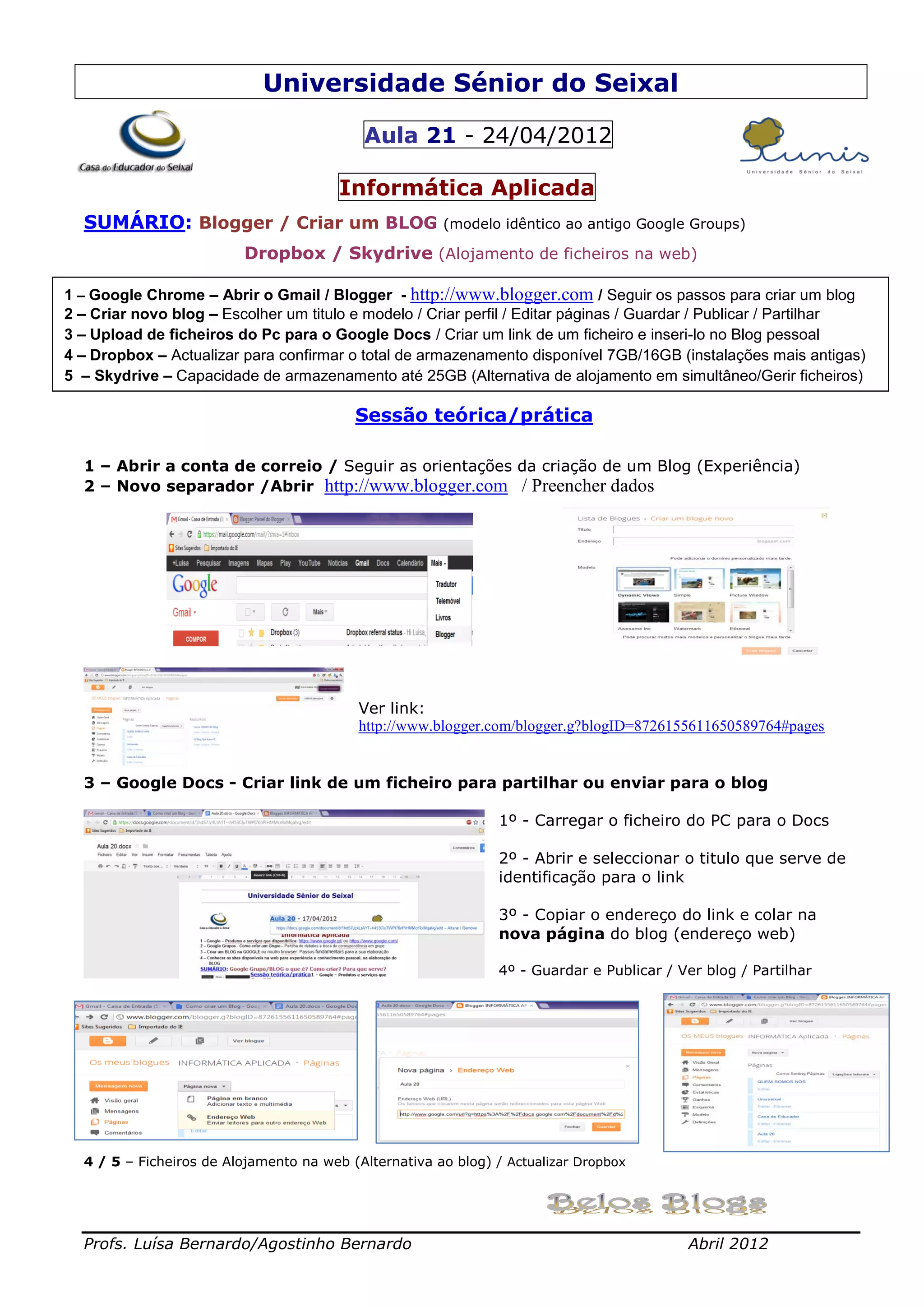 1) Criação de um blog pessoal utilizando a plataforma Blogger para partilhar conteúdos e ficheiros online.
