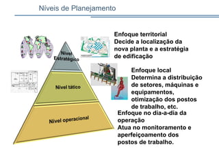 O documento discute os diferentes níveis e tipos de planejamento tático de layout fabril. Apresenta os focos inter e intra-departamentais do planejamento tático e exemplifica um layout nesse nível. Também descreve os principais tipos de layouts de acordo com o volume e variedade de produção, incluindo os layouts fixo, por produto, celular, modular, fractal e funcional.