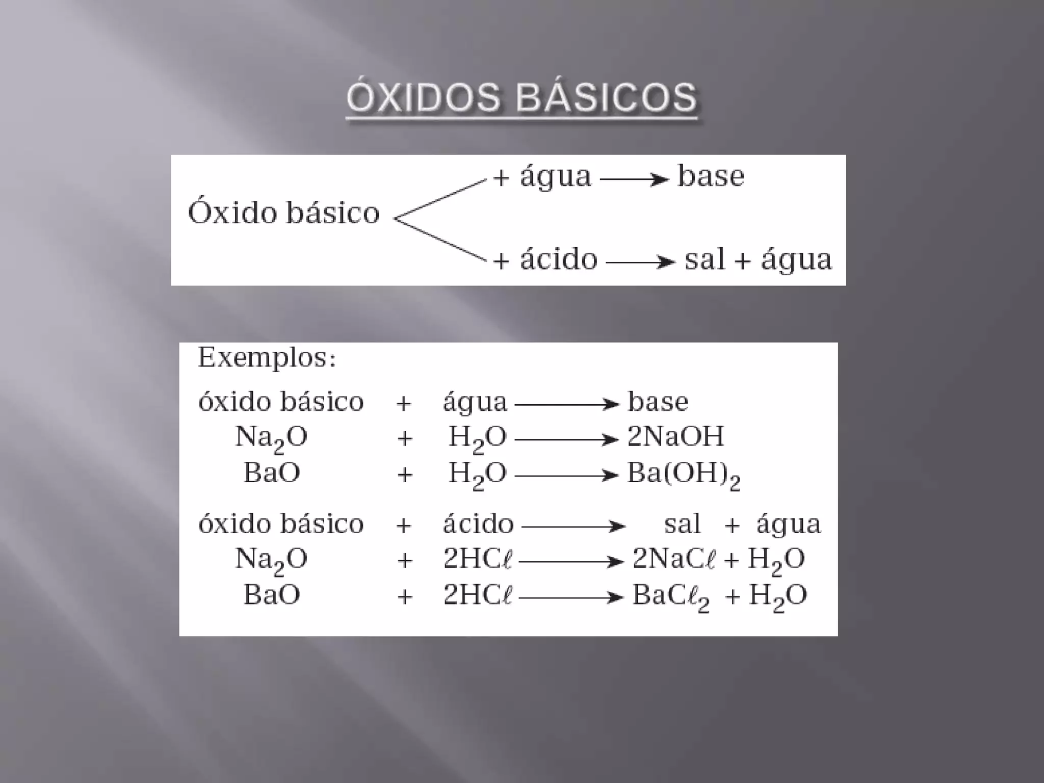 Os óxidos básicos como K2O e CaO reagem com água formando bases e com ácidos formando sais e água. Os óxidos neutros como CO, NO e N2O são formados por ametais e são inertes, não reagindo com água, ácidos ou bases.