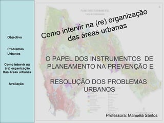 O documento analisa os problemas urbanos enfrentados nas áreas urbanas e discute a importância do planejamento urbano para mitigar esses desafios, como congestionamento, degradação de edifícios e segregação social. Aborda instrumentos de planejamento, como planos diretores e de urbanização, que visam reorganizar e requalificar espaços urbanos, melhorando a qualidade de vida. Também destaca a necessidade de intervenções integradas e programas como o POLIS para a revitalização e valorização ambiental das cidades.
