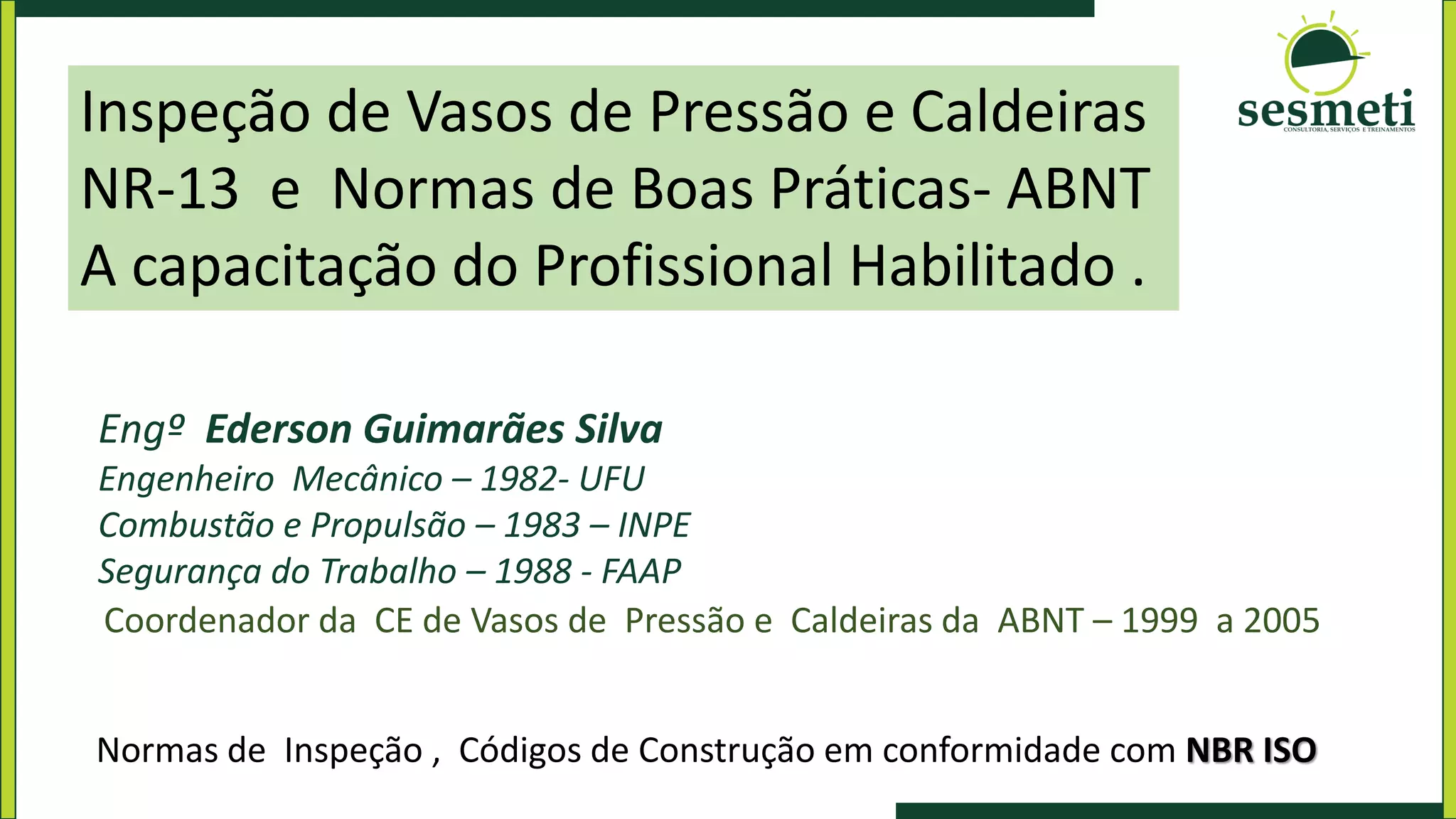 O documento discute a capacitação de profissionais habilitados para inspeção de vasos de pressão e caldeiras, de acordo com a NR-13. Apresenta as qualificações do palestrante e descreve os requisitos da norma, incluindo escopo de aplicação e atribuições dos profissionais habilitados. Também fornece exemplos de aplicações como caldeiras e inspeções realizadas.