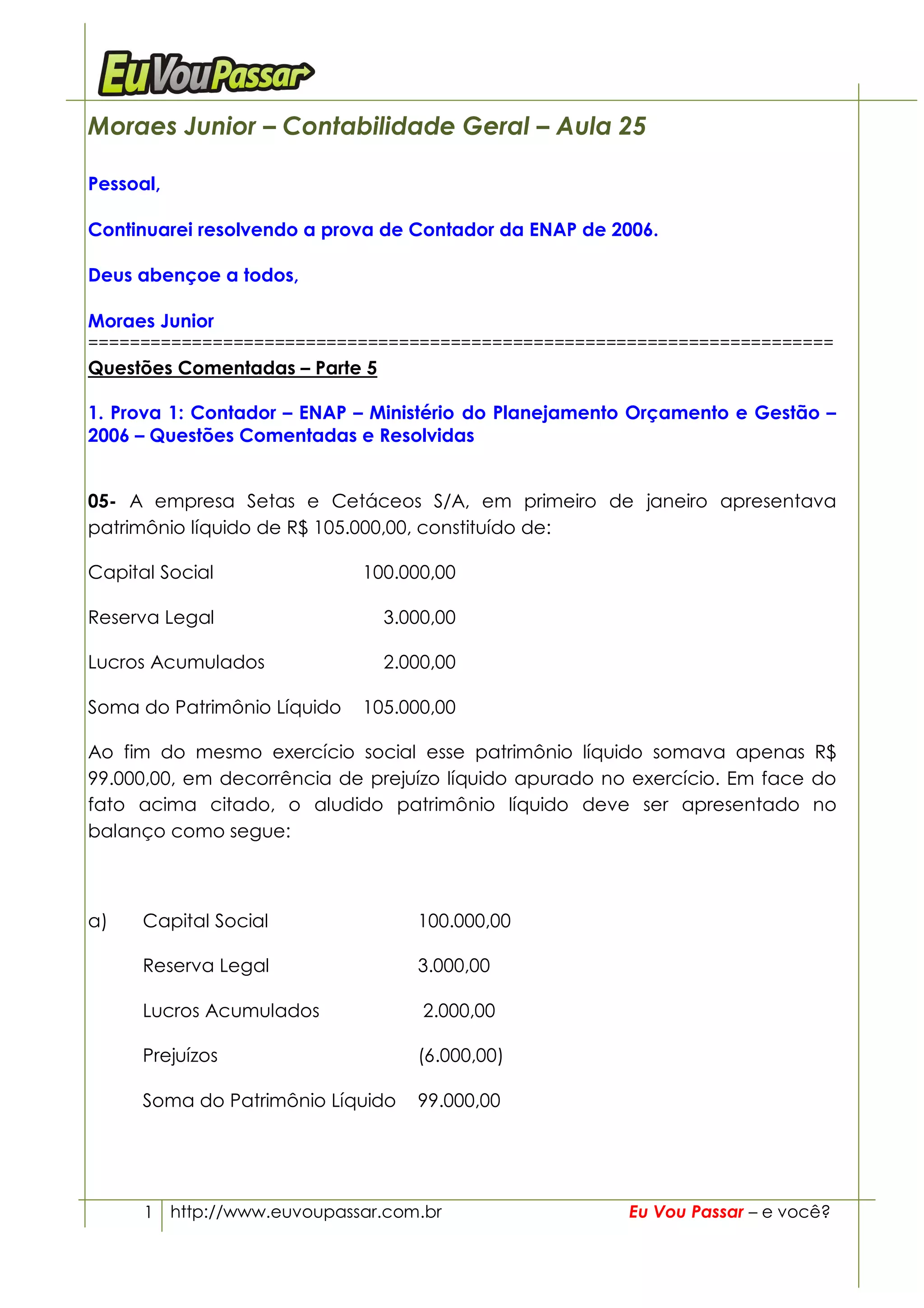 O documento discute a resolução de uma questão sobre como apresentar o patrimônio líquido de uma empresa no balanço quando houve prejuízo no exercício. Explica que de acordo com a lei, o prejuízo deve ser absorvido primeiro pelos lucros acumulados, depois pela reserva legal, e apresenta um exemplo numérico para ilustrar o processo de absorção do prejuízo. A resposta correta para a questão proposta é a alternativa D.