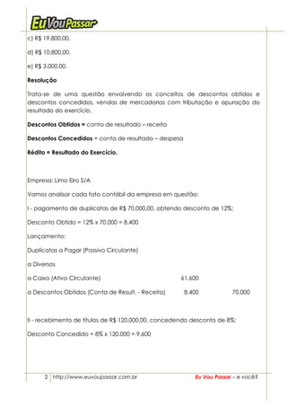 O documento resume uma aula sobre contabilidade geral e questões comentadas de uma prova de contador. O autor comunica que em breve publicará um livro sobre contabilidade geral e posteriormente um livro com resoluções de exercícios do primeiro livro. As questões comentadas envolvem cálculos de descontos, impostos e apuração de resultados em operações comerciais.