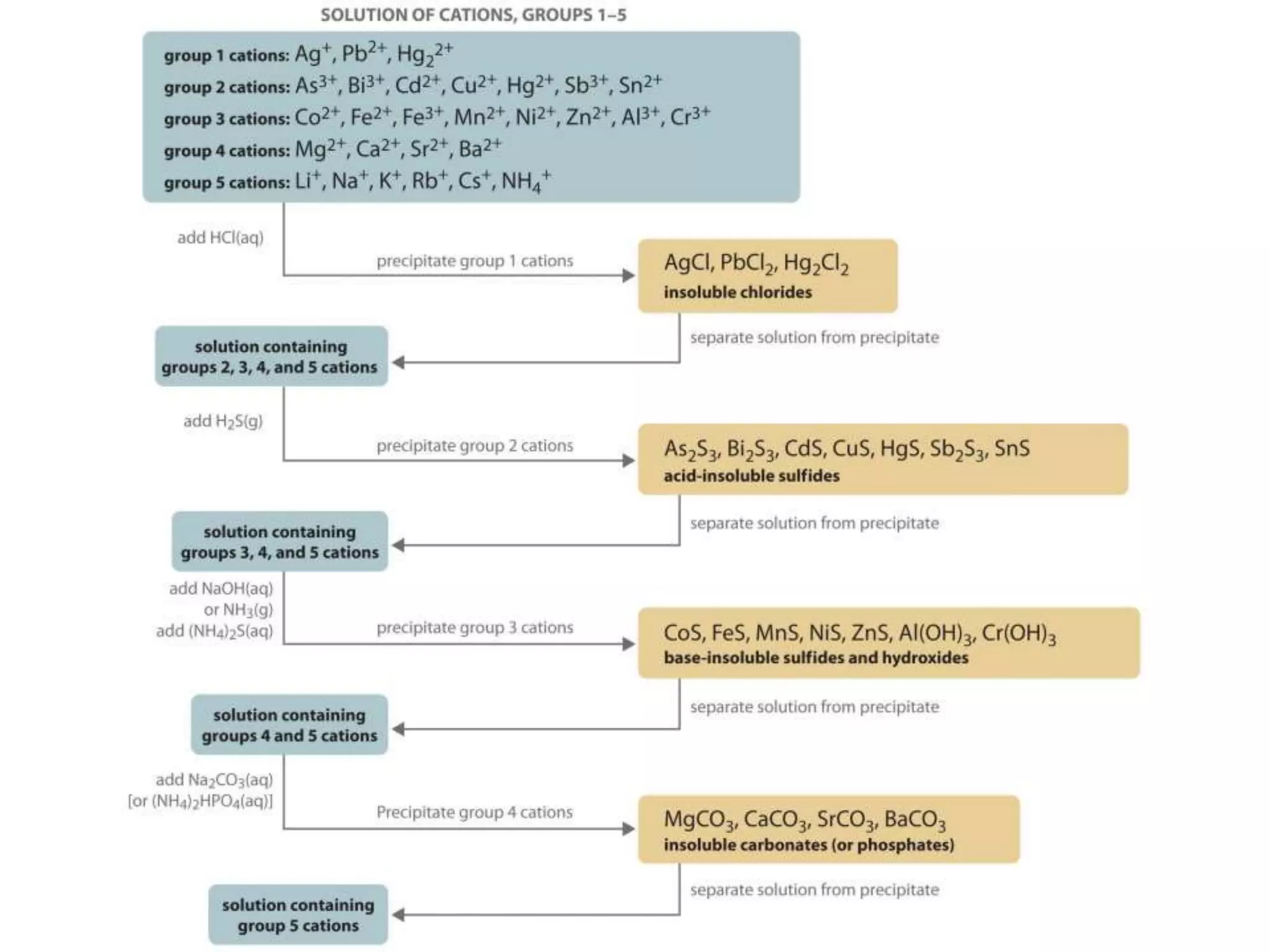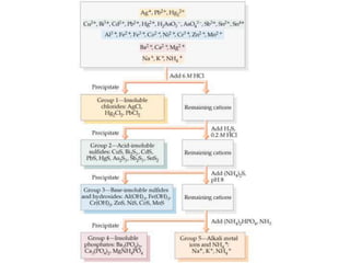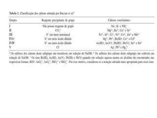 O documento discute procedimentos analíticos qualitativos para a identificação de cátions em grupos. Apresenta perguntas sobre os grupos 3-4 de cátions, incluindo sua solubilidade e separações. Também cobre grupos 4-5, reações químicas de identificação e o uso de reagentes como NH4OH e H2O2.