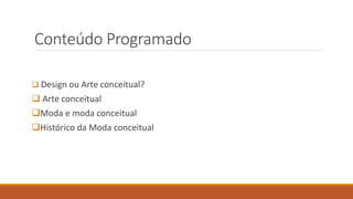 O documento discute a moda conceitual, definindo-a como uma abordagem experimental e reflexiva na moda que coloca a mensagem acima da funcionalidade por meio da expressividade. Explora a relação entre arte conceitual e moda conceitual, além de apresentar exemplos históricos como Elsa Schiaparelli e características de designers conceituais como Alexander McQueen e Alexandre Herchcovitch.
