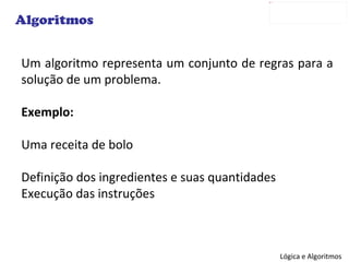 O documento discute algoritmos, definindo-os como um conjunto de regras para solução de problemas. Apresenta etapas para construção de algoritmos, como definir entrada, processamento e saída de dados. Descreve diferentes tipos de algoritmos como descrição narrativa, pseudocódigo e fluxograma. Por fim, fornece exemplos e exercícios para fixação dos conceitos.