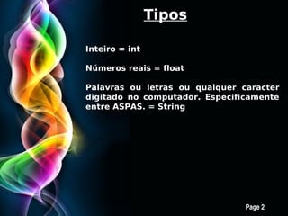 O documento apresenta os tipos de dados int, float e string em Python e explica operações aritméticas e relacionais com esses tipos. Também mostra funções para manipular strings, como contar caracteres, converter para maiúsculas e minúsculas, dividir em palavras e substituir substrings.