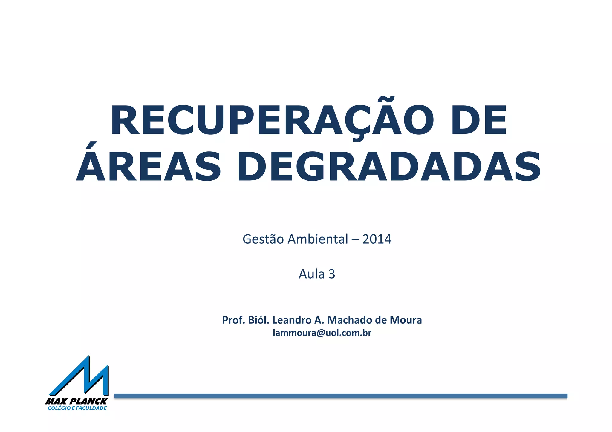 O documento descreve a história da legislação e da recuperação de áreas degradadas no Brasil desde 1862. Destaca leis importantes como a Constituição Federal de 1988 que estabeleceu o direito a um meio ambiente ecologicamente equilibrado e obrigações de recuperação de áreas degradadas. Também menciona a criação do Sistema Nacional de Unidades de Conservação em 2000 e do Programa Nacional de Florestas em 2000.