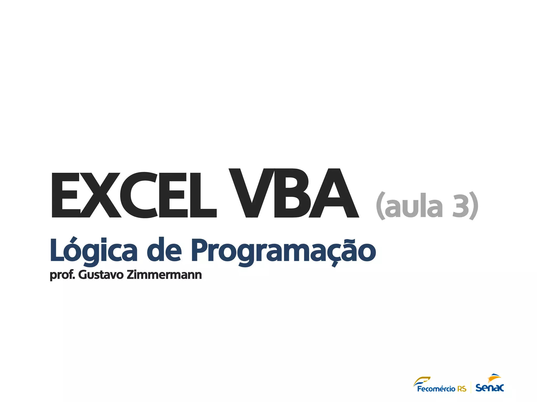 O documento apresenta uma aula sobre lógica de programação em VBA no Excel, cobrindo estruturas de controle como SE...ENTÃO, SE...ENTÃO...SENÃO, SELECIONE...CASO e estruturas de repetição como ENQUANTO...FAÇA, REPITA...ATÉ QUE e PARA...DE...ATÉ...PASSO. Exemplos e exercícios são fornecidos para demonstrar o uso dessas estruturas.