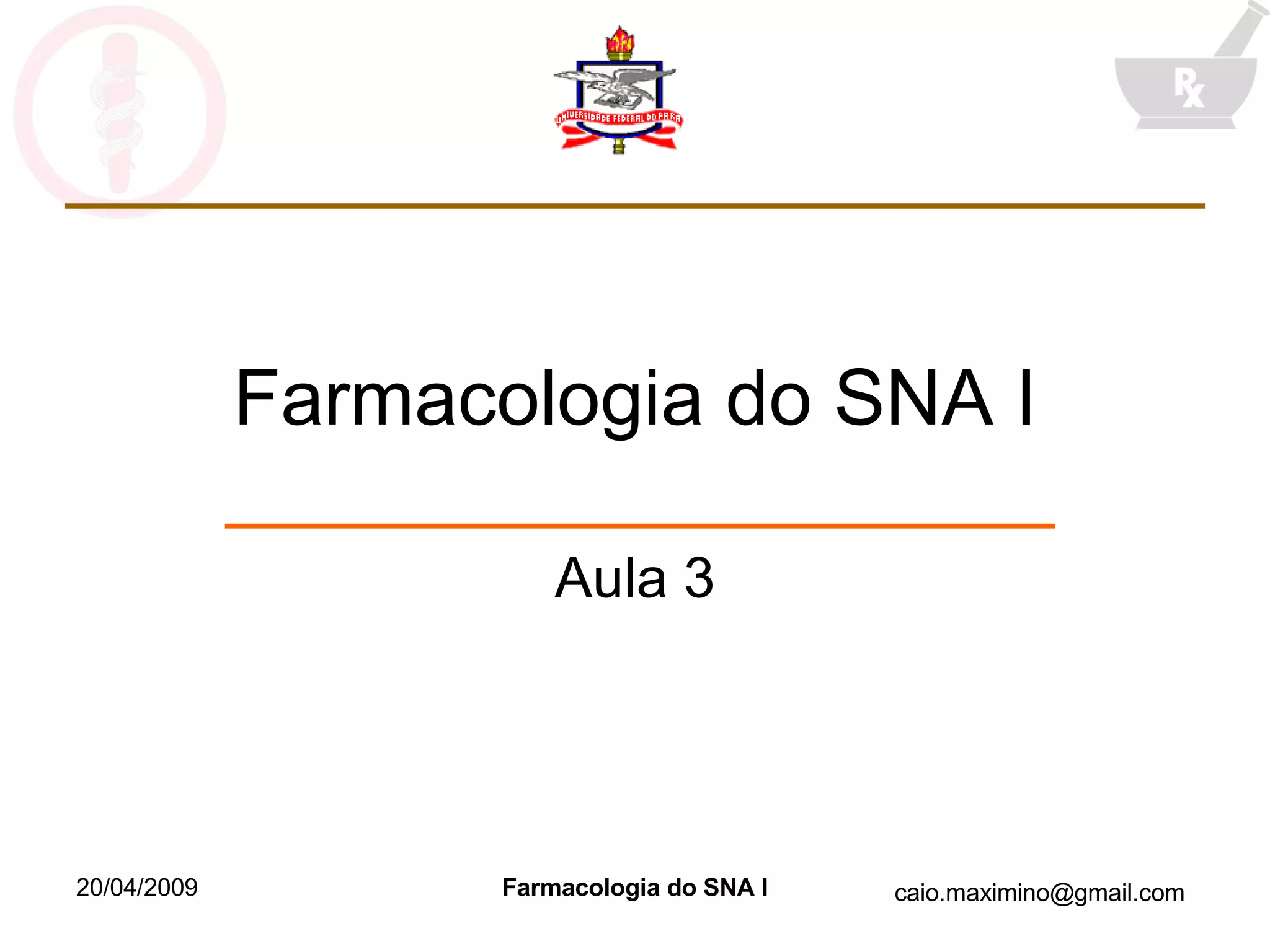 Este documento discute a anatomia, neuroquímica e farmacologia do sistema nervoso autonômico (SNA). Ele descreve a organização dos eixos simpático e parassimpático, incluindo os neurotransmissores noradrenalina e acetilcolina, bem como os receptores e processos envolvidos. O documento também aborda os princípios da sinapse nervosa e os mecanismos de transmissão de informações no SNA, incluindo os tipos de sinais químicos envolvidos e as propriedades dessas
