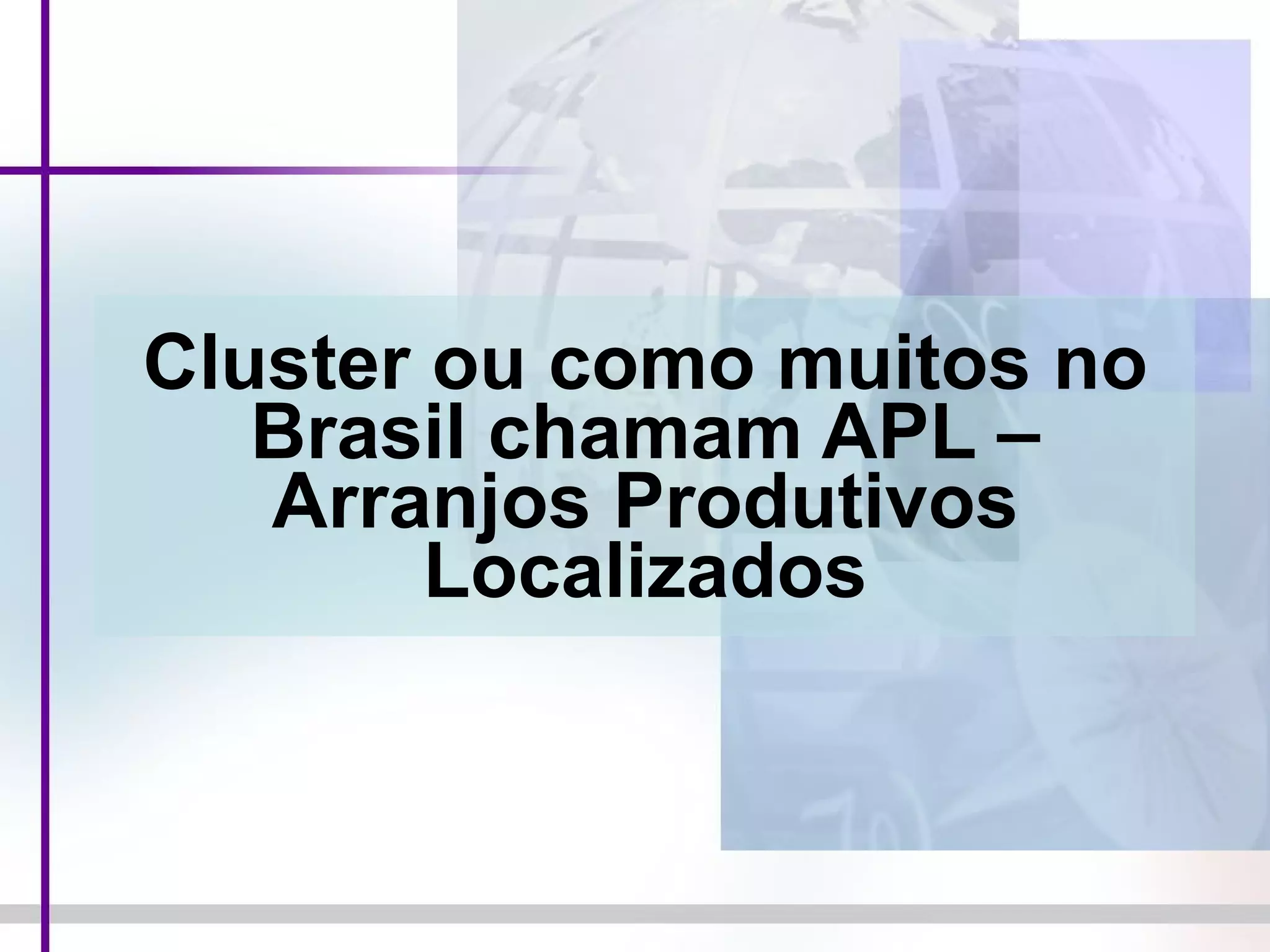 Um cluster é definido como um agrupamento geográfico de pequenas e médias empresas de uma mesma cadeia produtiva que se beneficiam de economias de aglomeração e cooperação. Para atingir seu máximo potencial competitivo, um cluster deve ter concentração geográfica, diversidade e especialização de empresas, cooperação entre elas, além de inovação tecnológica compartilhada.