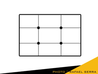 O documento discute os conceitos e técnicas de composição fotográfica, incluindo a disposição dos elementos na imagem, equilíbrio de cores e formas, e sete regras gerais para criar uma boa composição como a regra dos terços e evitar cortar articulações. Também menciona diferentes estilos de composição como simétrica, radial, horizontal e diagonal.