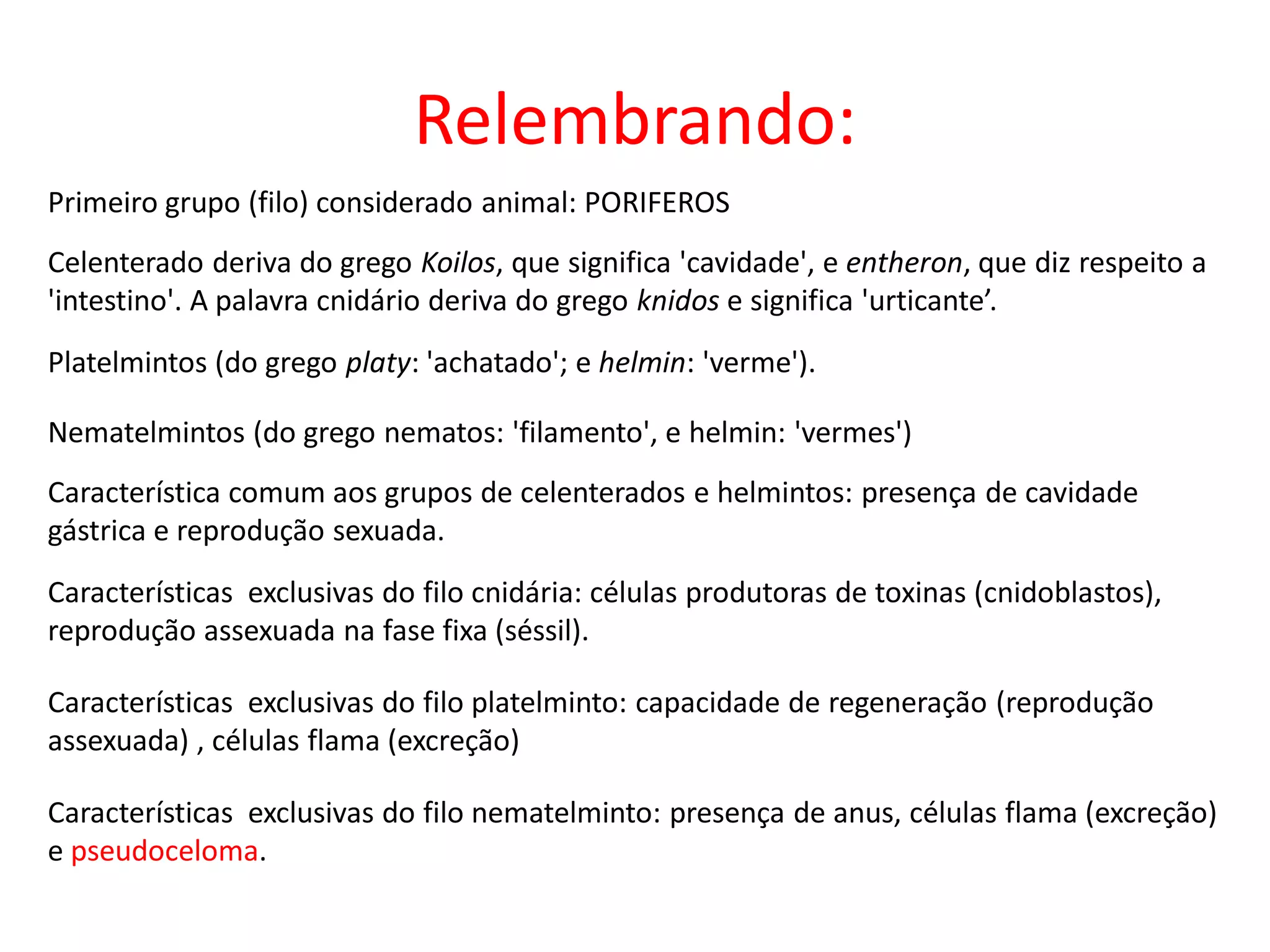 O primeiro filo considerado animal são os poríferos. Os filos cnidários e helmintos compartilham a característica de possuírem cavidade gástrica e reprodução sexuada. Anelídeos apresentam metameria, ou seja, seu corpo é dividido em segmentos iguais.