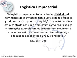 A logística empresarial trata de todas as atividades relacionadas ao fluxo de produtos e informações desde a aquisição de matérias-primas até o consumo final pelo cliente. Ela inclui funções primárias como transporte, manutenção de estoques e processamento de pedidos e funções de apoio como armazenagem e embalagem. Uma logística integrada é essencial para fornecer níveis adequados de serviço ao cliente a um custo razoável.