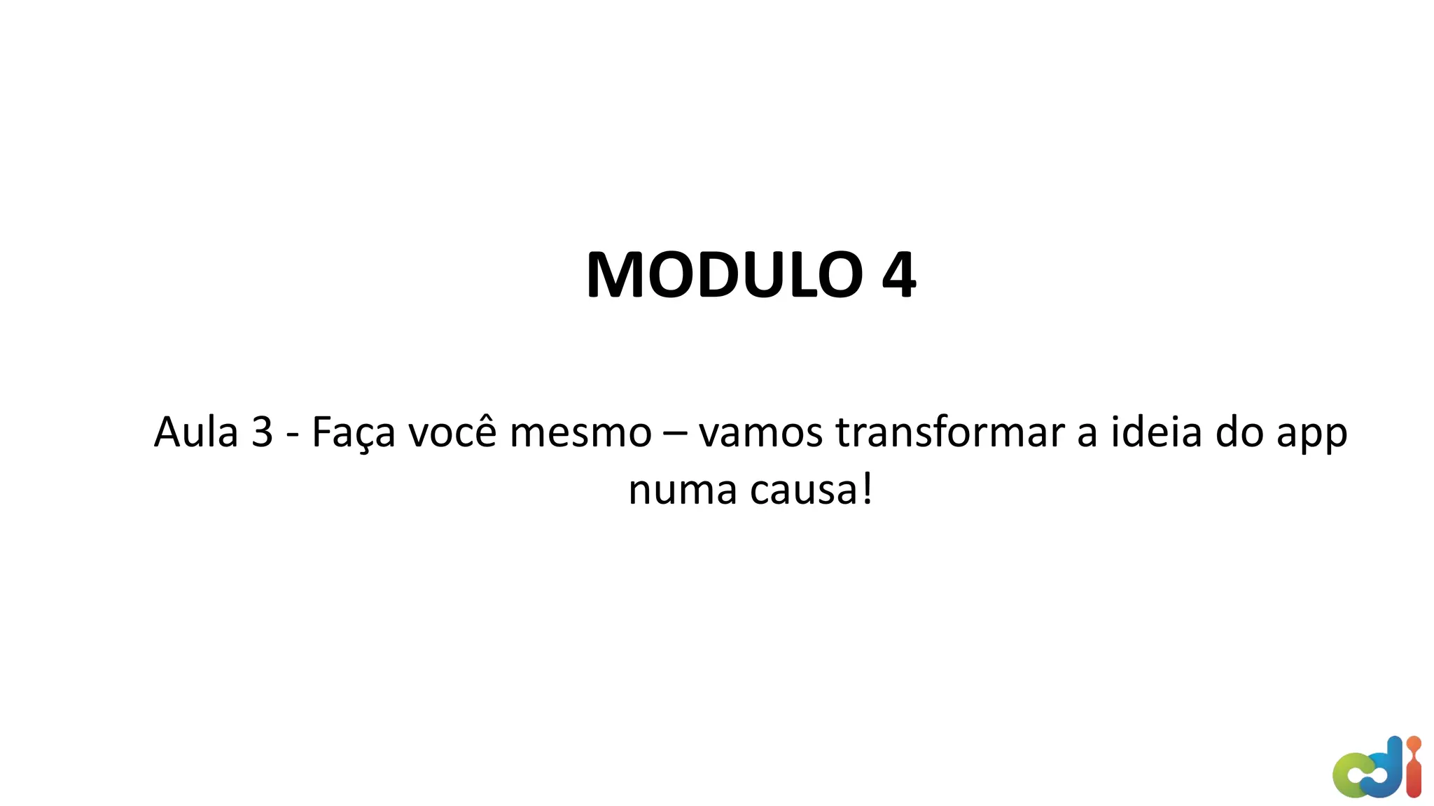 A aula 3 do módulo 4 ensina como transformar uma ideia de aplicativo em uma causa, definindo causa como um motivo, ideal ou ação judicial, e dá exemplos de causas como redução de tarifas de transporte público, preservação da Amazônia e revitalização de praças. A aula também pergunta qual é a causa do aluno e como inseri-la na plataforma #nareal.