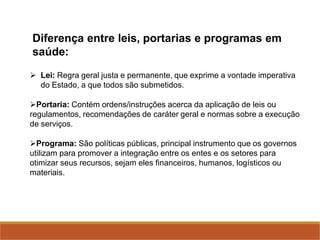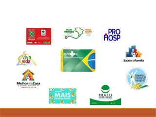 O documento descreve os programas de saúde Saúde da Família, Mais Médicos e Farmácia Popular, definindo seus objetivos, estrutura e funcionamento. O programa Saúde da Família promove a saúde da população por meio de equipes multiprofissionais. O Mais Médicos leva médicos para regiões carentes e investe em unidades básicas. A Farmácia Popular fornece medicamentos gratuitos ou com desconto para doenças crônicas.