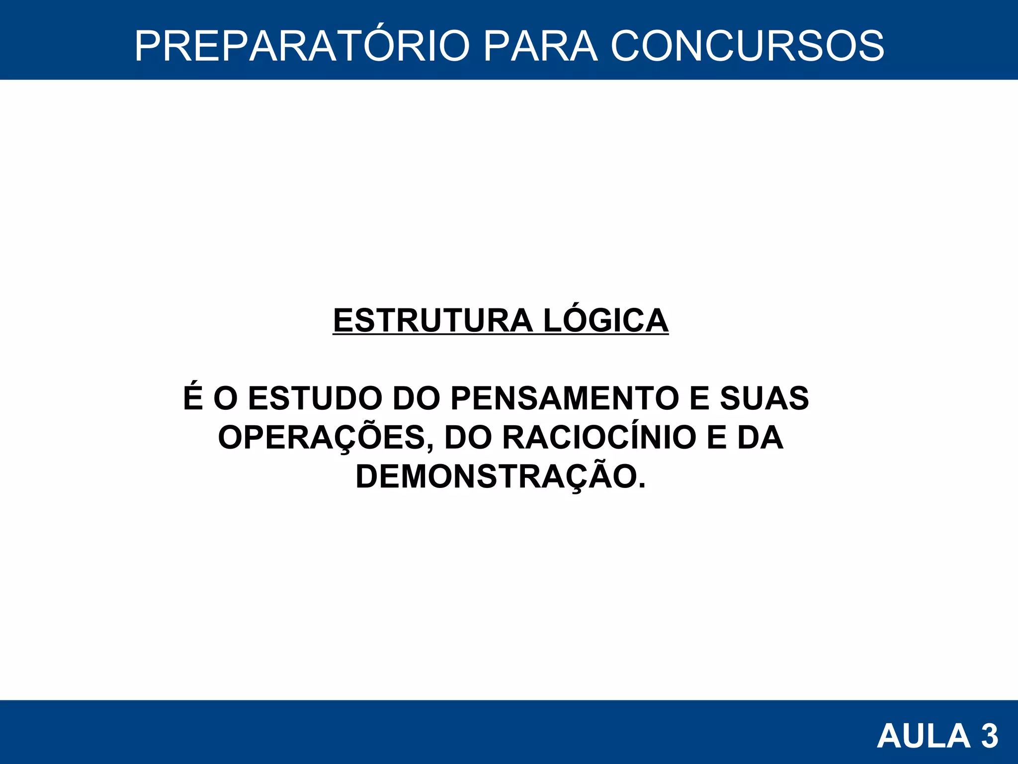 O documento discute os conceitos básicos de estrutura lógica, incluindo proposições, conectivos lógicos e tabelas-verdade. Aborda os tipos de proposições, como proposições simples e compostas, e explica os principais conectivos lógicos como conjunção, disjunção, negação, condicional e bicondicional.