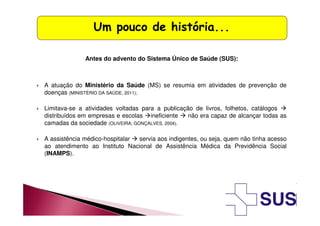 O documento descreve a evolução do sistema de saúde brasileiro antes e depois da criação do Sistema Único de Saúde (SUS) em 1988. Antes do SUS, o acesso à saúde era restrito e dividido em categorias. O movimento da reforma sanitária defendia saúde como direito universal. Isso levou à criação do SUS, garantido na Constituição de 1988 e regulamentado por leis, com o objetivo de oferecer atendimento igualitário gratuito a toda população.