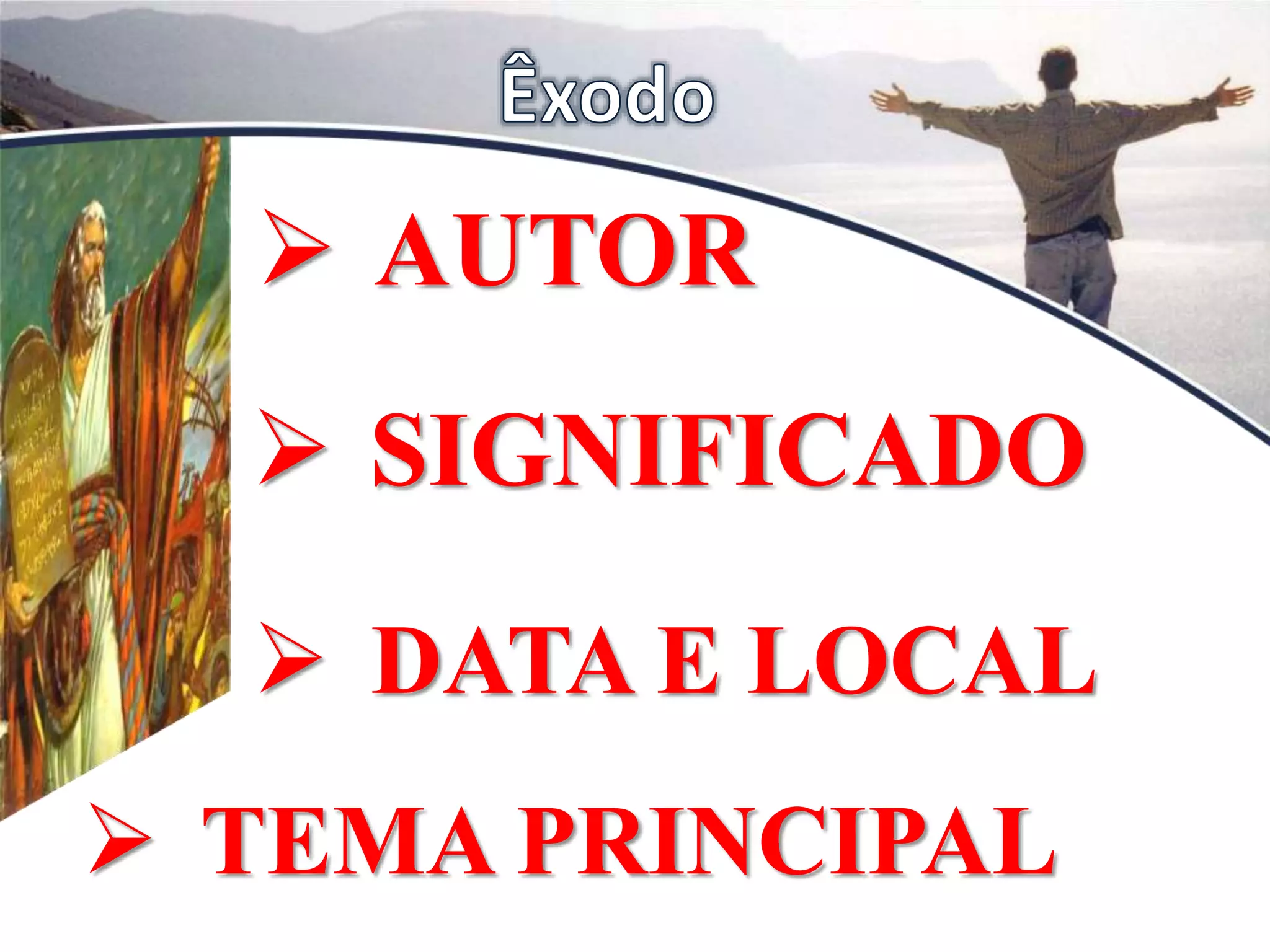 O livro de Êxodo narra a história de Israel desde a morte de José até a construção do Tabernáculo, incluindo a saída do Egito sob a liderança de Moisés. Define a aliança entre Deus e Israel e revela o caráter de Deus através de seus atos poderosos de libertação. Israel peregrinou 40 anos no deserto até chegar à Terra Prometida.