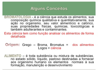 O documento discute a introdução à análise de alimentos. A análise de alimentos tem como objetivo principal estudar os constituintes químicos e nutricionais dos alimentos, como carboidratos, proteínas, vitaminas e minerais. Ela é importante para determinar a composição e qualidade dos alimentos, estabelecer informações nutricionais e garantir a segurança do consumo. Vários métodos analíticos podem ser usados, dependendo da amostra, exatidão necessária e recursos disponíveis.