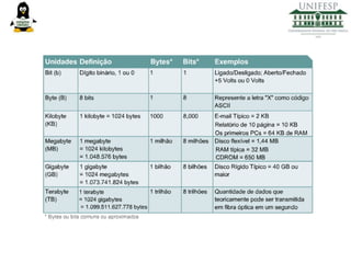 O documento discute o tamanho dos arquivos e as unidades de medida de dados como bit, byte, kilobyte e gigabyte. Também explica como os arquivos podem ser movidos usando as opções de copiar e recortar no menu de contexto do mouse e a diferença entre recortar e copiar um arquivo.