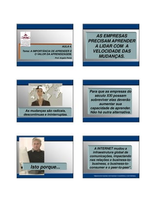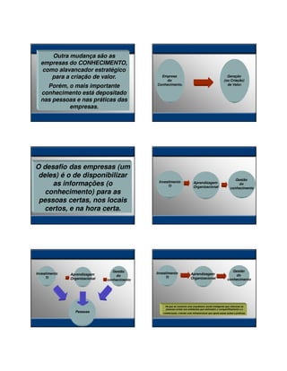 O documento discute a importância da aprendizagem para as empresas do século 21 devido às rápidas mudanças. Ele explica que as empresas precisam aumentar sua capacidade de aprendizagem para sobreviver e destaca diferentes tipos de aprendizagem, incluindo aprendizagem tópica, analítica, emocional, social, política, ética e voltada para a ação.