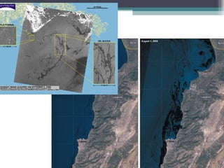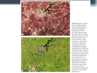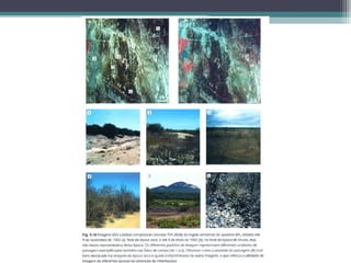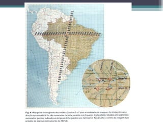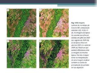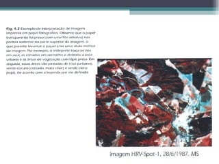O documento discute a interpretação de imagens de satélite, elementos-chave para a interpretação como tonalidade, textura e forma, e fatores a serem considerados na seleção de imagens como resolução, bandas espectrais e objetivos.
