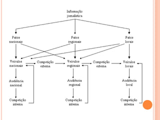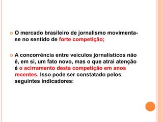 O documento descreve a intensificação da concorrência entre veículos de mídia no Brasil, com o surgimento de novos canais, jornais, revistas e serviços de informação online. Isso amplia as opções do público e faz com que os veículos busquem estratégias de diferenciação para atrair audiências, como especialização do conteúdo e ofertas de produtos adicionais. A competição ocorre entre veículos locais, regionais e nacionais em busca de fatias do mercado de audiência.