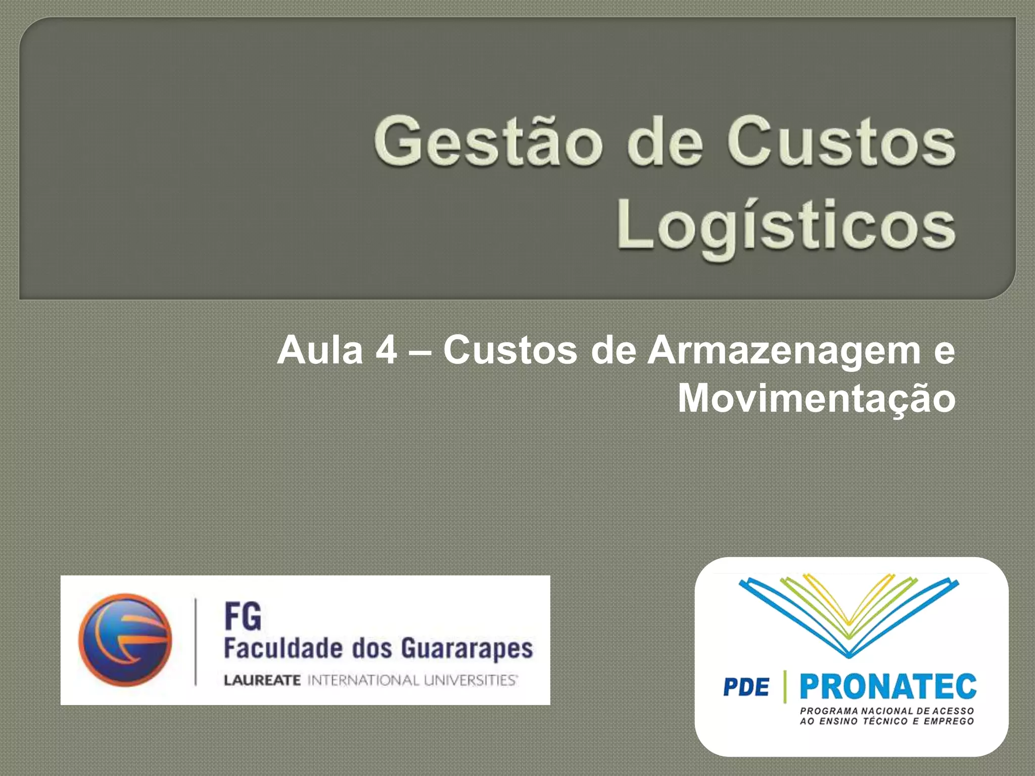 O documento discute os custos de armazenagem, incluindo custos fixos como aluguel, energia e salários, e custos variáveis como manutenção e equipamentos. Explica como identificar, agrupar e alocar esses custos às atividades de armazenamento e movimentação de produtos, e eventualmente aos próprios produtos e clientes.