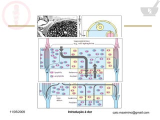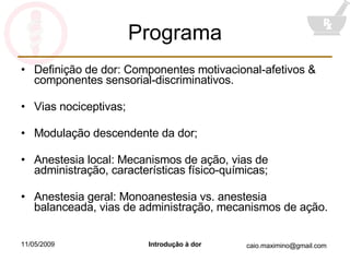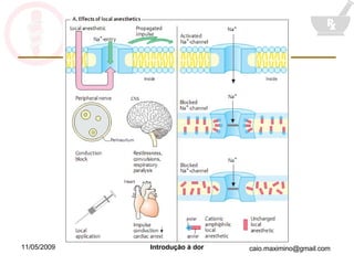 O documento discute a fisiologia da dor e da anestesia. Explica que a dor envolve componentes sensoriais e afetivos, e que a nocicepção envolve a estimulação de nociceptores. Descreve as vias nociceptivas, a modulação descendente da dor, e os mecanismos de ação da anestesia local e geral.