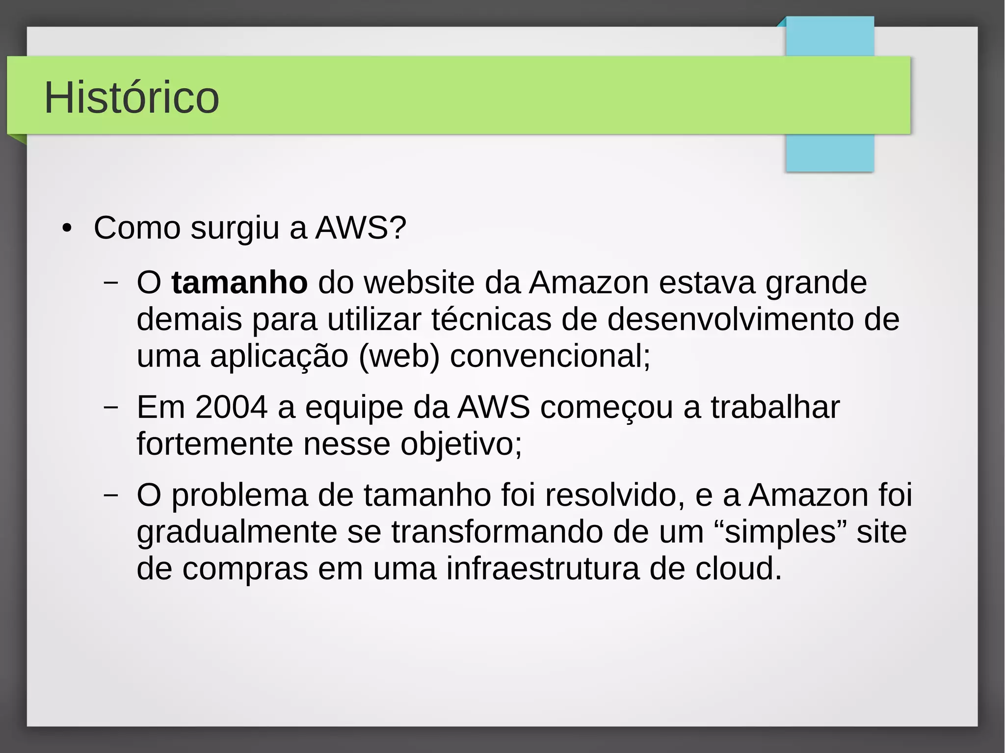 A AWS surgiu para resolver os problemas de escalabilidade do site da Amazon. Seus primeiros serviços foram SQS, S3 e EC2, permitindo comunicação entre componentes, armazenamento escalável na nuvem e computação elástica por hora. Posteriormente lançou outros serviços como RDS, ELB, Auto Scaling e CloudWatch para armazenamento de dados, balanceamento e monitoramento de carga.