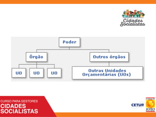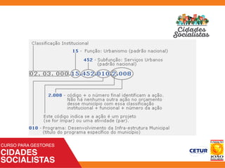 3) O documento explica os principais elementos que compõem um orçamento público, como a proposta orçamentária, o quadro de detalhamento da despesa, e as três classificações orçamentárias.