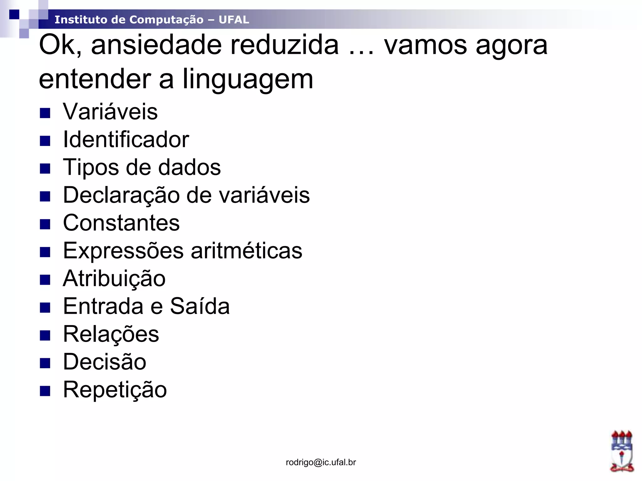 O documento discute conceitos fundamentais da linguagem C, incluindo variáveis, identificadores, tipos de dados, declaração de variáveis, constantes, expressões aritméticas, atribuição e estrutura básica de um programa em C.