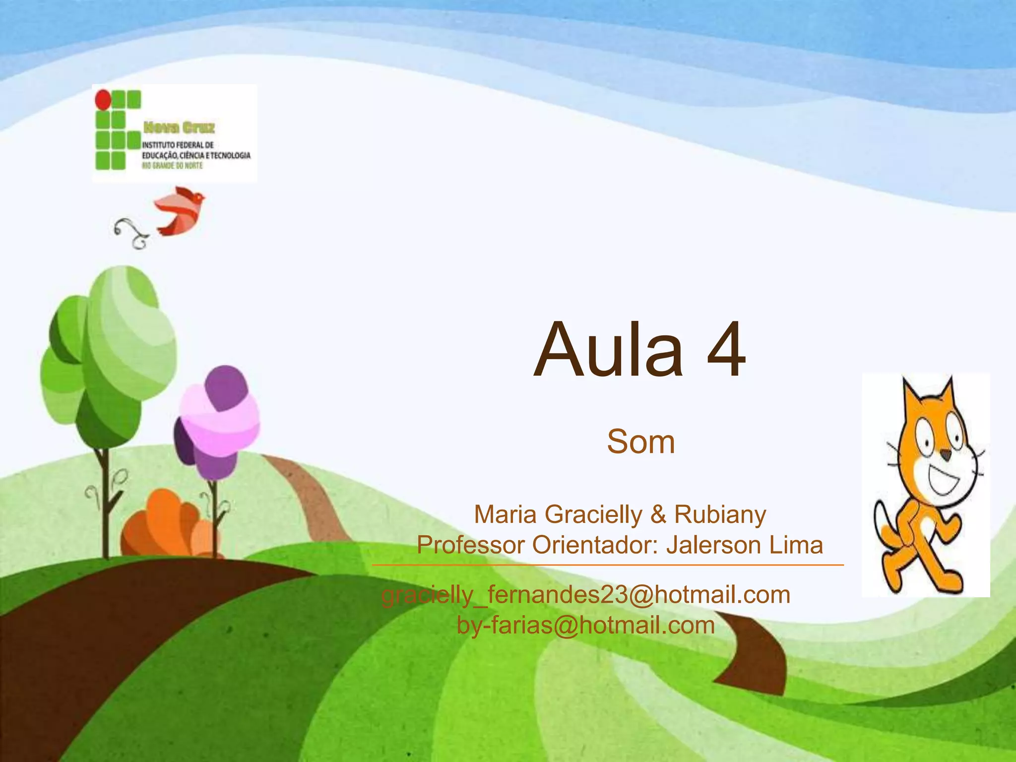 O documento discute a paleta de som no Scratch, introduzindo os principais blocos como tocar som, mudar volume e instrumento. Ele ensina como importar sons e usá-los com blocos, e desafia o leitor a criar um projeto onde um sprite se move e troca trajes ao som de tambores.