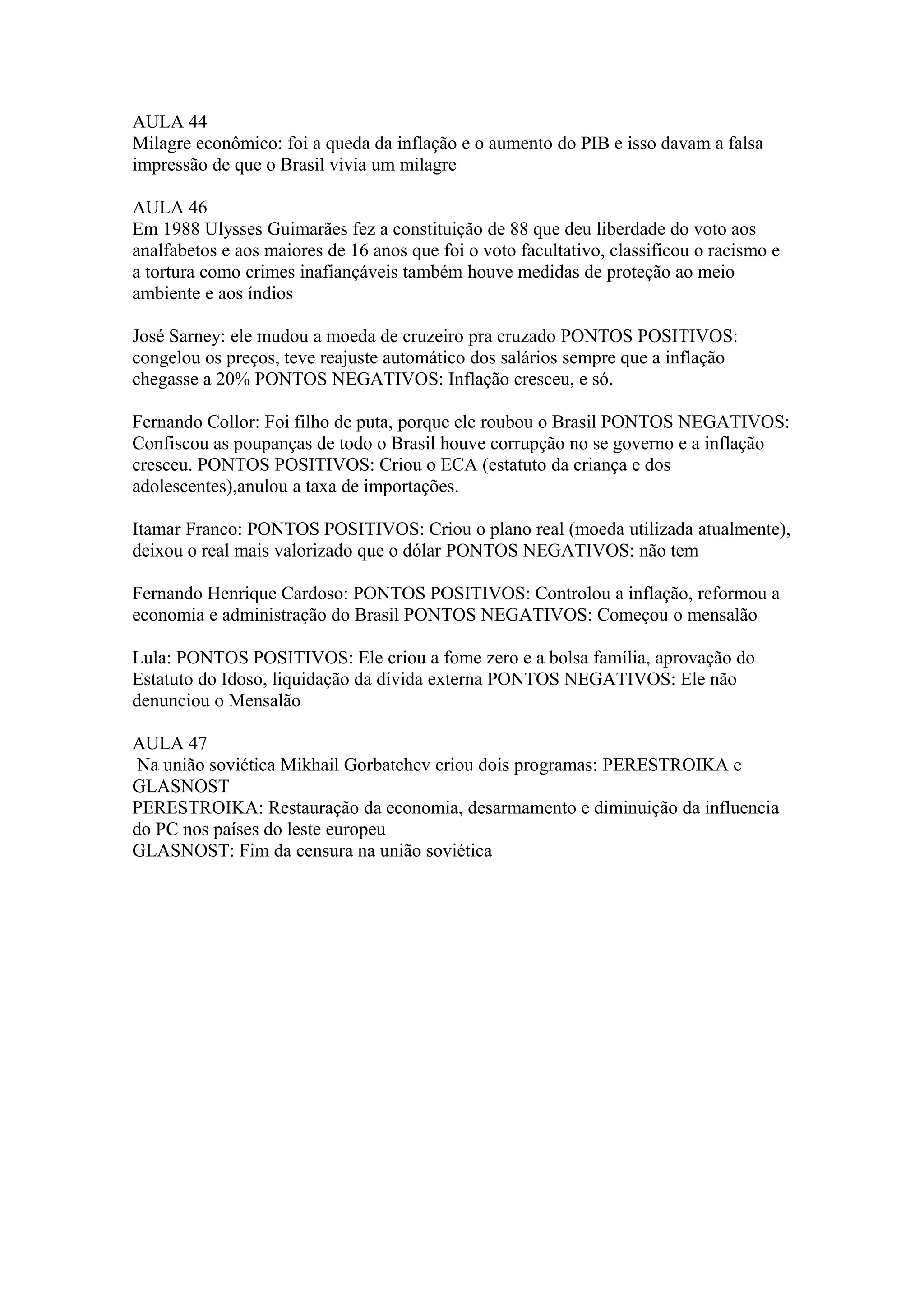 O documento resume os principais acontecimentos econômicos e políticos do Brasil entre as décadas de 1980 e início de 2000, incluindo o período do "milagre econômico", a nova Constituição de 1988, as presidências de Sarney, Collor, Itamar, FHC e Lula, além de resumir as políticas de Perestroika e Glasnost implementadas por Gorbachev na antiga União Soviética.